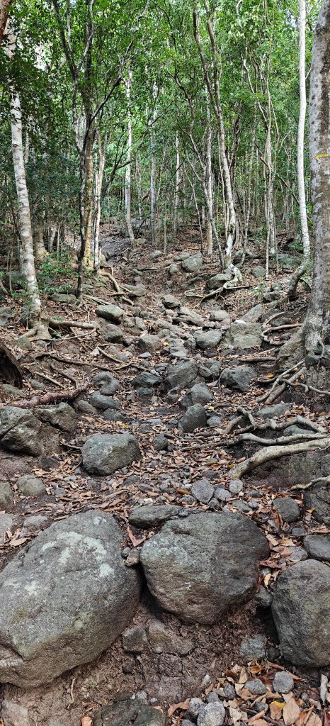 The path starts with the barely visible three steps next to the wooden post in the photo below but quickly becomes a fairly steep 30-minute ascent over rocks and tree roots. I’d certainly suggest walking shoes for this one and to avoid it after heavy rain as I can imagine it becomes slippery in places.